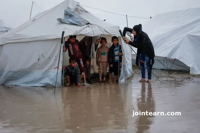 In Gaza City and surrounding areas, rows of tents made from tarpaulins, salvaged plastic, and blankets tied to wooden poles sag under the rain. Muddy paths and collapsed drainage channels turn streets into flowing water hazards, while families try to salvage their soaked belongings.