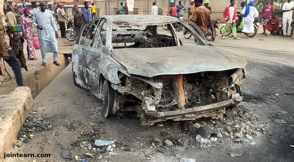 Ado-Ekiti, Ekiti State – Furious youths in the Atikankan area of Ado-Ekiti set a brand-new vehicle ablaze after it reportedly ran over a local meat seller. The vehicle, believed to belong to a suspected internet fraudster, commonly referred to as a Yahoo Boy, sparked public outrage following the incident.