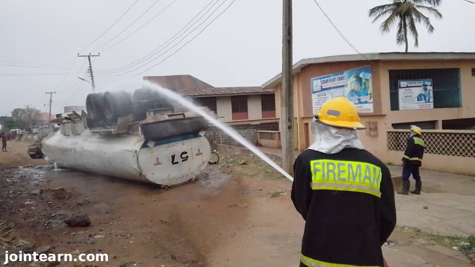 A Mack trailer with registration DEP175XB (Lagos), carrying 33,000 litres of PMS, swerved into a ditch at Lasi 2, Liberty Academy, Odo-Ona, Elewe, Ibadan. The fuel spilled, but no casualties were recorded. Firefighters applied chemical foam to suppress flammability and prevent fire. - Second Incident – Ogbomoso (Thursday):