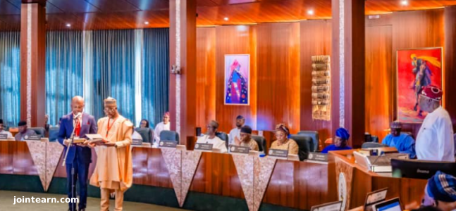 Immediately after the swearing-in, the FEC meeting commenced, led by Tinubu, with key officials including SGF Senator George Akume, HoCSF Mrs. Esther Didi Walson-Jack, Chief of Staff Femi Gbajabiamila, NSA Mallam Nuhu Ribadu, ministers, and special advisers, discussing a report on the state of the economy presented by Minister of Finance Wale Edun.