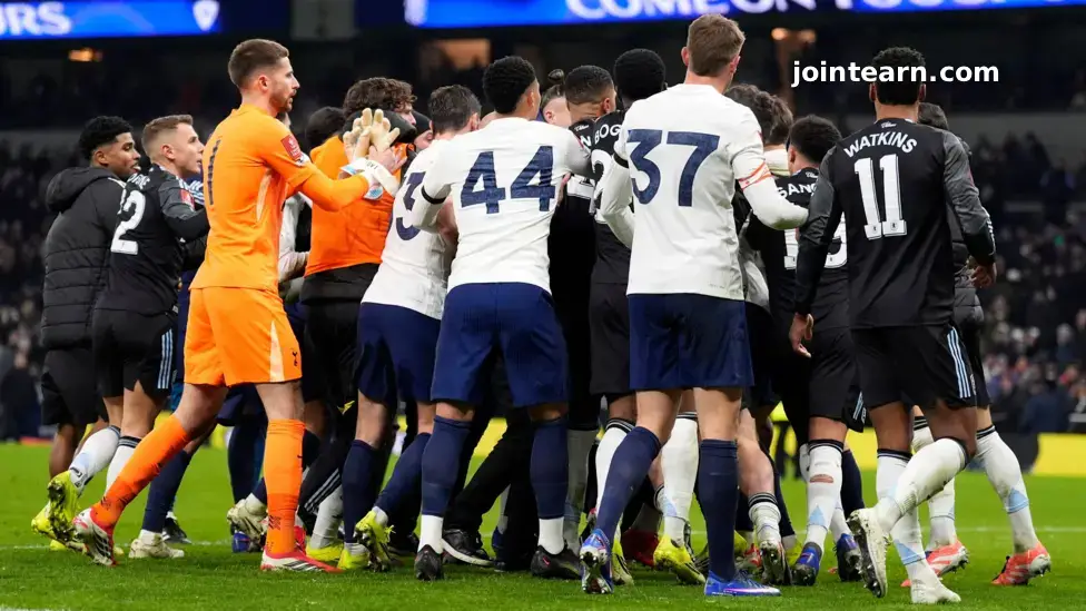 The incident occurred immediately after Aston Villa secured a 2-1 victory over Spurs, leaving Thomas Frank’s side eliminated from the competition. According to the FA, players and officials from both clubs were involved in confrontations and unsporting behavior shortly after the final whistle.